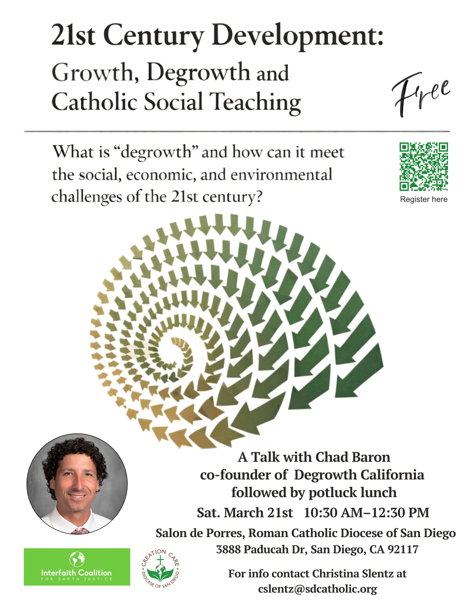 Salon de Porres, Roman Catholic Diocese of San Diego 3888 Paducah Dr, San Diego, San Diego, CaliforniaToday, the world faces a plethora of challenges, environmental and social, that demand we consider what truly healthy and sustainable development can be. Chad Baron, Co-founder of Degrowth California, will lead us in a discussion of Catholic Social Teaching on …